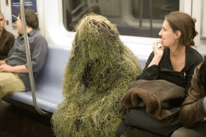 Mężczyzna w kostiumie ghillie postanowił „wtopić się” w otoczenie… choć wybrał do tego metro.