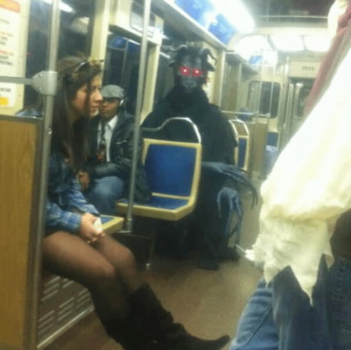 Jeden z pasażerów wybrał dość przerażający strój – całkowicie czarny kostium demona z rogami i czerwonymi oczami.