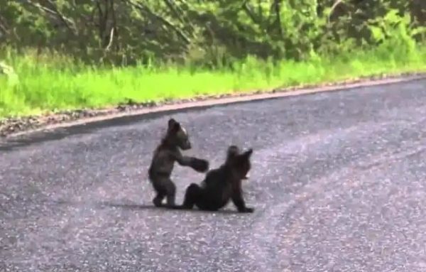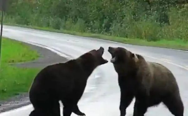 Puii de urs nu sunt singurele animale care campează pe drum. Când este sezonul de împerechere, urșii mari nu le pasă unde ajung într-o luptă.