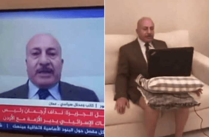 Bluze business, pantaloni casualMajid Asfour, fost redactor-șef al ziarului iordanian Al Rai Arabic, contestă stereotipurile despre cum ar trebui să arate un analist. Într-un interviu cu Al Jazeera, el arăta profesionist într-un costum. Cu toate acestea, trebuia să fie îmbrăcat complet. În timpul unui interviu înfundat pe Skype, un alt videoclip pe Twitter îl arată proptindu-și laptopul pe două perne. A optat pentru haine mai confortabile. Abu Dhabi Network a publicat videoclipul, care a fost distribuit pe scară largă.