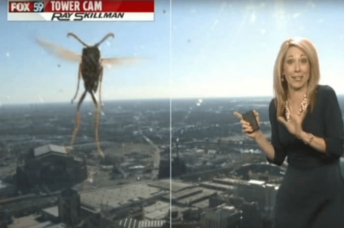 Ancora meteo Fox 59 Jennifer Ketchmark a oferit o prognoză meteo în direct într-o zi însorită în Indianapolis. O albină uriașă a apărut în obiectivul camerei, întrerupând spectacolul. Ketchmark țipă și dispăru din cadru.