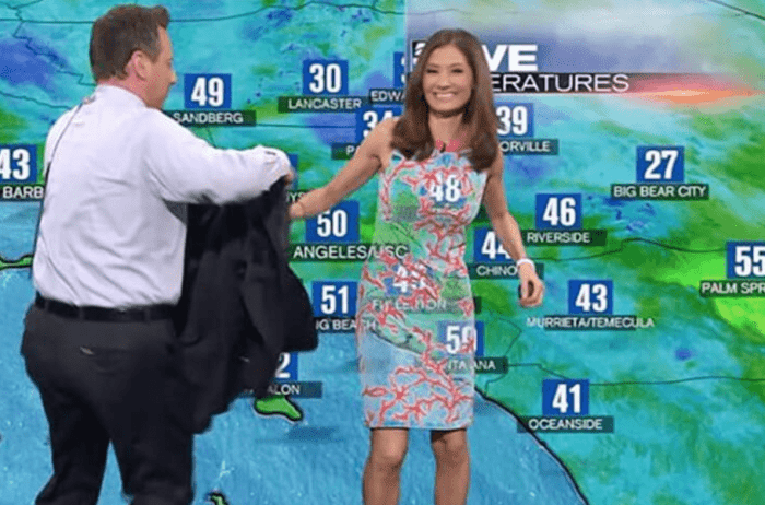 Prezentatoarea meteo Liberte Chan a avut o întâlnire amuzantă când alegerea ei de ținută a făcut-o să se amestece într-un ecran verde. Chan a devenit aproape invizibil în fundal. Un coleg s-a oferit să o lase să poarte jacheta lui în fața camerei.