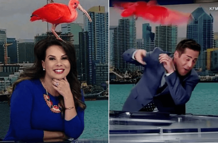 În 2018, un ibis stacojiu a surprins prezentatorii CBS News 8 Morning News în timp ce erau la televizor în direct. Ibisii stacojii sunt păsări medii până la mari care zboară la sol care sunt înrudite cu berzele.