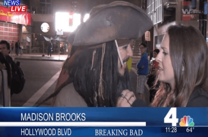 Un videoclip cu căpitanul Jack Sparrow din Pirații din Caraibe a devenit viral. Jess Weber a întrerupt-o pe reporterul NBC 4 Madison Brooks în timpul premierei filmului Breaking Bad pe Hollywood Boulevard.