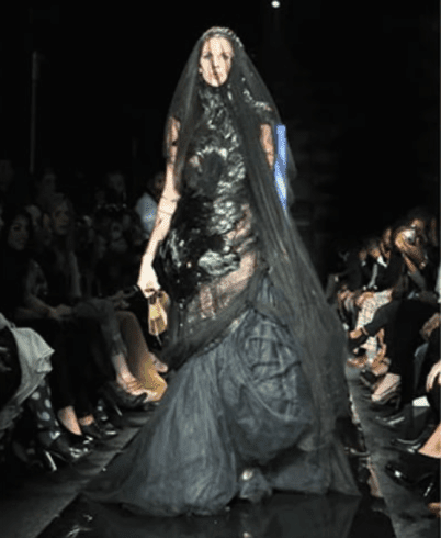 Buried under a mountain of dark layers might be a stunning dress—if only we could see it. The heavy fabrics and dramatic styling entirely swallow up any elegance it might have had. While pushing fashion boundaries can be exciting, this creation feels more like a theatrical prop than a bridal statement. Instead of mysterious romance, it gives a “gothic stage costume.” With a bit of moderation, it could have been breathtaking. Instead, it’s just… a lot.