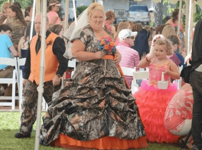 When Mama June and Sugar Bear renewed their vows in 2012, no one expected a traditional lace gown—and she delivered exactly that: a full camouflage wedding dress. Fans of Here Comes Honey Boo Boo weren’t shocked, but the look definitely made waves. Complete with hunter-orange accents (yes, the kind required for safety), it was part wedding, part outdoor adventure. Not timeless, perhaps—but undeniably unforgettable.