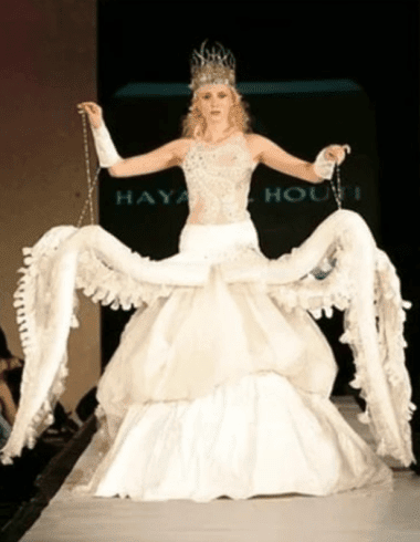With swirling black details and tentacle-like drapery, this gown looks straight out of a Disney villain’s wardrobe. It’s dramatic, theatrical, and striking—but calling it a wedding dress might be generous. As a costume, it’s stunning. As bridal wear? Let’s say the only thing missing is a trident and a villain monologue.