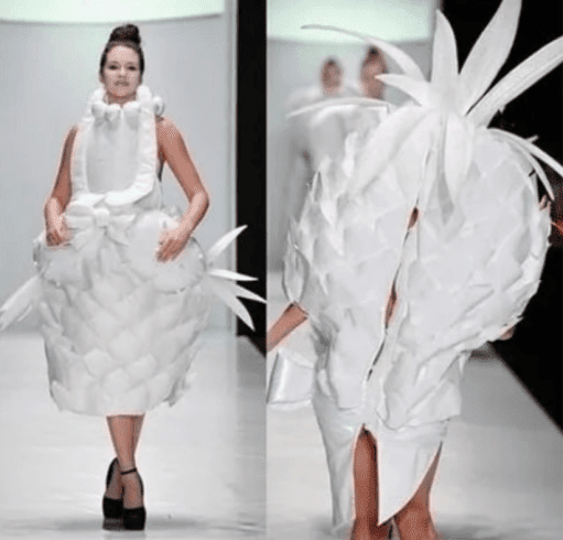 Every so often, a designer gets inspired by… wildlife. The back of this gown unmistakably resembles a duck—complete with rounded “feathers” and a quirky, puffed-up silhouette. The front doesn’t help its case either, resembling a pincushion of protruding textures. It’s bold, imaginative, and undeniably conversation-worthy—but maybe better suited for an art gallery than an altar.